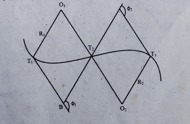 When a curve consists of two or more arcs with different , is called a compound curve. Such a curve lies on the same side of a common tangent and the centre of the different arcs lie on the same side of their respective tangents.